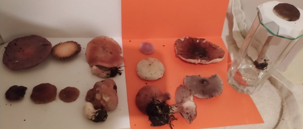 Dość powiedzieć, że nie brakło nam kolorów, więc od różowych owocników Mycena rosea czyli grzybówki różowej (trującej), poprzez zielonkawoniebieskie owocniki pierścieniaka grynszpanowego Stropharia aeruginosa (raczej nie polecany do jedzenia) do fioletowych owocników lakówki ametystowej Laccaria amethistina (jadalnej), mieliśmy feerię barw wśród grzybowych owocników.