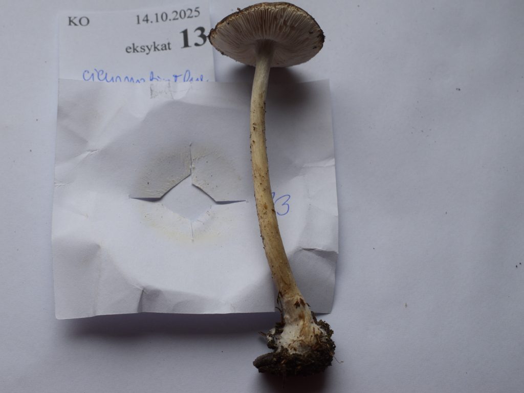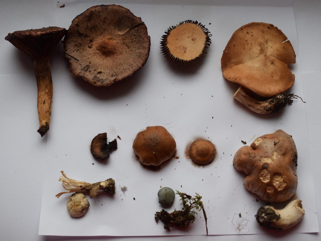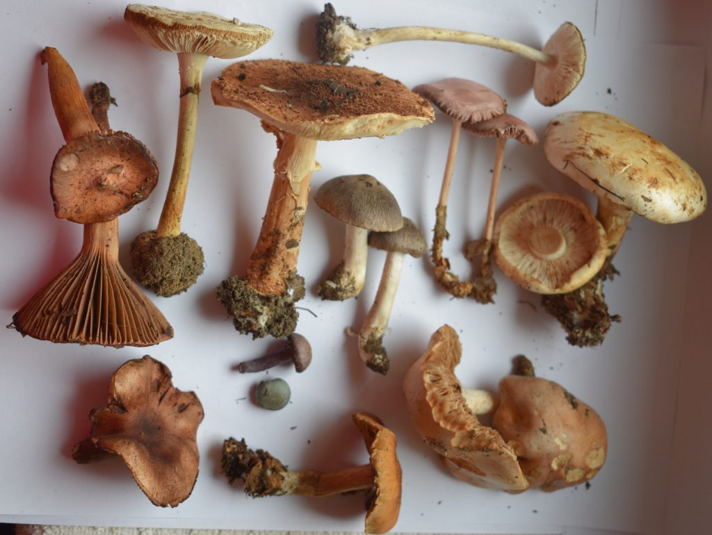 A zaczęliśmy naszą tamtejszą przygodę od rosnących przy pniu drzewa owocników trującej i gorzkiej maślanki wiązkowej Hypholoma fasciculare, a potem to już w większości towarzyszyły nam grzyby trujące np.: brązowe zasłonaki Cortinarius sp., biały strzępiak ziemistoblaszkowy Inocybe geophyla, jeżoskórka (dawniej czubajeczka) ostrołuskowa Echinoderma asperum ze spiczastymi łuskami na kapeluszu i nieprzesuwalnym pierścieniem na trzonie, a także gąska żółtobrunatna Tricholoma fulvum, ziemistoblaszkowa Tricholoma terreum oraz +/- gąska gołębia Tricholoma columbetta. Jeden zagadkowy owocnik o szarym kapeluszku, białych, nie różowiejących blaszkach i długim trzonie okazał się być zapewne ciemnobiałką Melanoleuca sp.