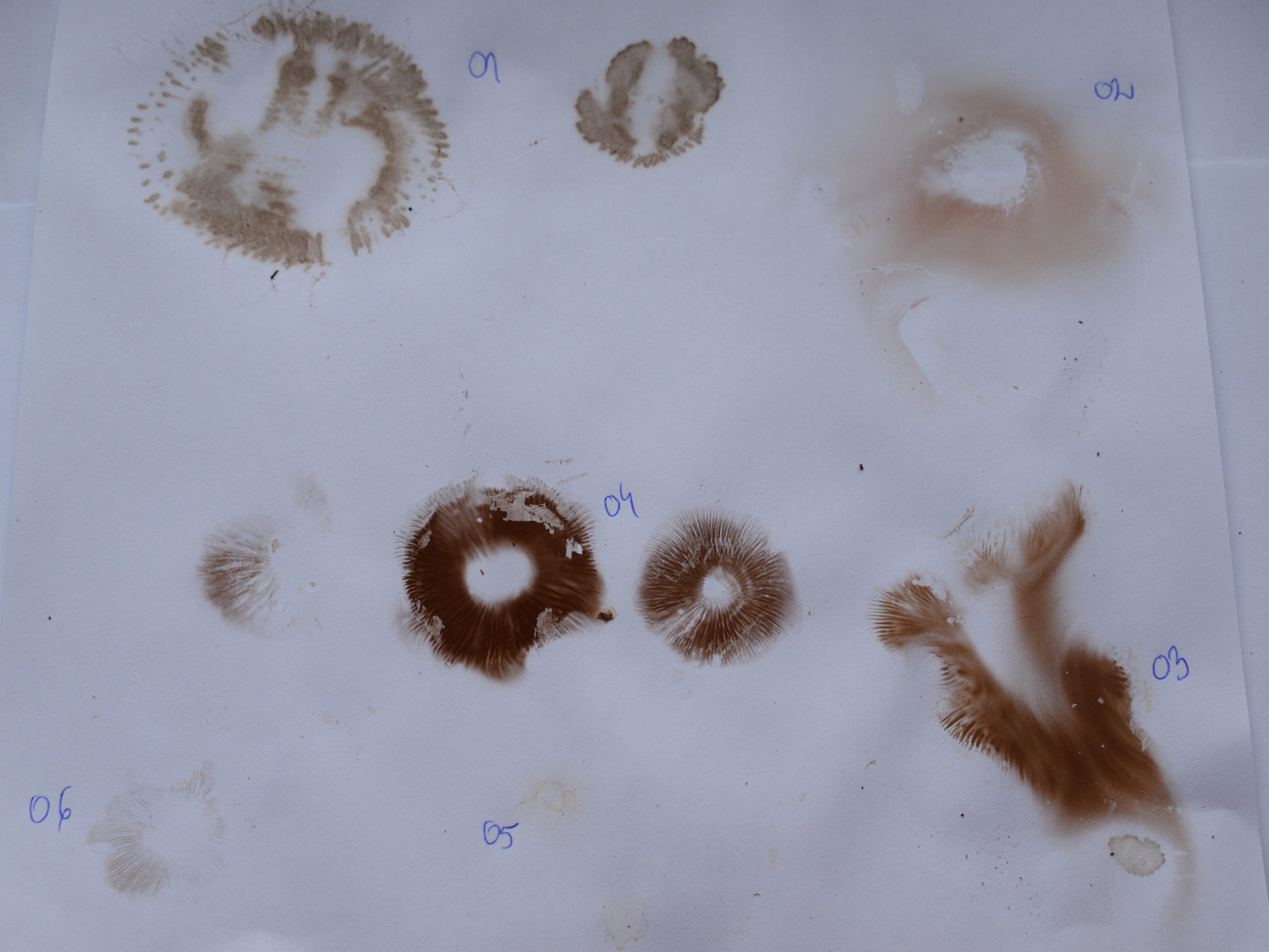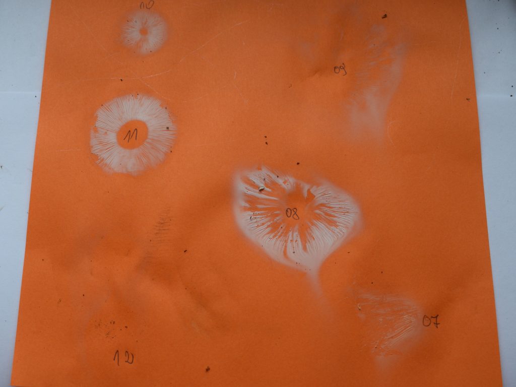 Po powrocie do domu nastawiłam wysypy zebranych owocników, ciemne na białej kartce papieru, a białe na kartce pomarańczowej, na zdjęciach można zobaczyć, jak niektóre z tych wysypów ładnie wyszły 🙂