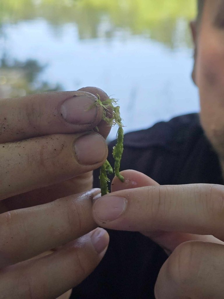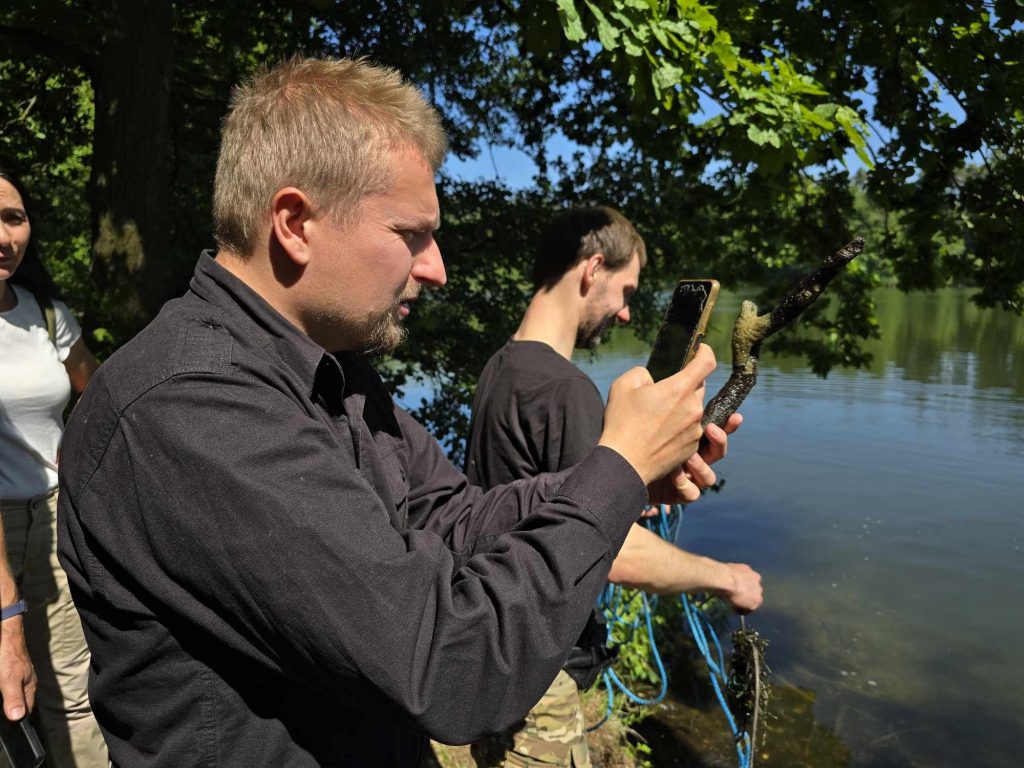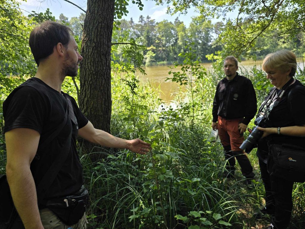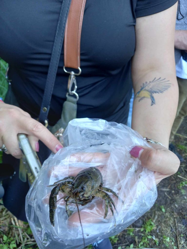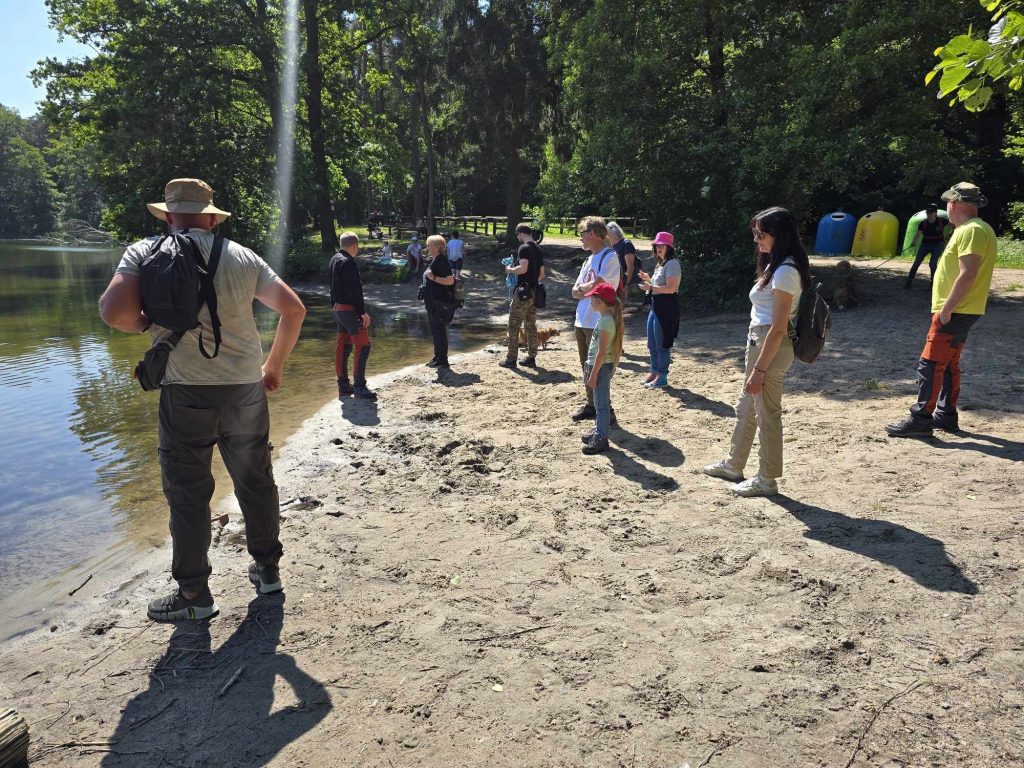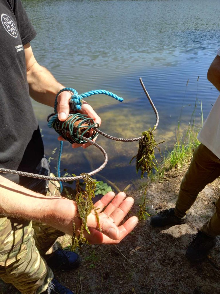 Zanim doszliśmy nad wodę przyglądaliśmy się sosnom masowo porażonym przez jemiołę, co jest zjawiskiem stosunkowo nowym i bardzo niepokojącym, świadczącym o słabej kondycji drzew w obliczu zmian klimatu. Podziwialiśmy też jeden z najpiękniejszych w regionie okaz dębu szypułkowego, rosnący przy parkingu. Rozważaliśmy o genezie powstania Jezior Babskich i związanym z tym ciekawym ukształtowaniem powierzchni. Przy brzegu znaleźliśmy liczne larwy chruścików, pełzające po dnie. Szukaliśmy jednego z naszych przyrodniczych symboli regionu – jezierzy morskiej. W tym celu posługiwaliśmy się specjalną kotwicą na linie. Sprawdziła się w boju, lecz niestety nasz plon był nader skąpy. Jedyną rośliną jaką udało się wyciągnąć z dna był wodny mech – zdrojek. Dużo ciekawszym „przyłowem” okazała się jakaś słodkowodna gąbka porastająca jedną z wyciągniętych zatopionych kłód. Było to przyczynkiem do rozważań na temat znaczenia takich zatopionych drzew, konarów, gałęzi dla organizmów wodnych, w tym ryb. Zwróciliśmy uwagę na żyjące w wodzie mięczaki, przede wszystkim na bardzo licznie występującą skójkę zaostrzoną, wrażliwą na zanieczyszczenie wody. Był też i rak, lecz niestety nie nasz szlachetny tylko obcy – pręgowaty, znacznie odporniejszy na zanieczyszczenia. Nad brzegiem jeziora Cyganek spotkaliśmy osobliwą turzycę nibyciborowatą oraz szalej jadowity. Dziwiliśmy się brązowemu kolorowi wody jeziora. Podziwialiśmy spotykane po drodze rośliny: kosaciec żółty, grążel żółty, rozchodnik wielki, dzwonek brzoskwiniolistny, kalinę koralową. Widzieliśmy liczne ślady żerowania bobra. Spotkaliśmy też owocniki osobliwego grzyba, który najprawdopodobniej był którąś z kustrzebek „wypaleniskowych”. Z drewnianego mostu nad Cybinką Maciej opowiadał o łęgu i rosnących w nim roślinach. Tu też zrobiliśmy sobie pamiątkowe zdjęcie. Dużo emocji budziły rzuty kotwicą i oczekiwanie na jezierzę ale niestety jej nie znaleźliśmy. Być może po prostu jej nie było ale możliwe, że to jeszcze zbyt wczesna pora na nią. Żartowaliśmy, że tytuł wyprawy był puszczeniem oka do uczestników. Ale chyba najważniejszy jest dobry humor i podziw dla otaczającej nas natury oraz możliwość poznania interesujących gatunków i ciekawostek przyrodniczych. A tego nie zabrakło!
