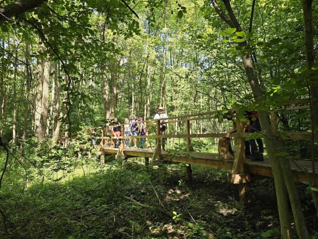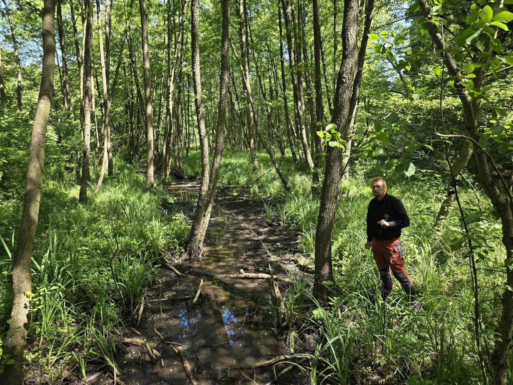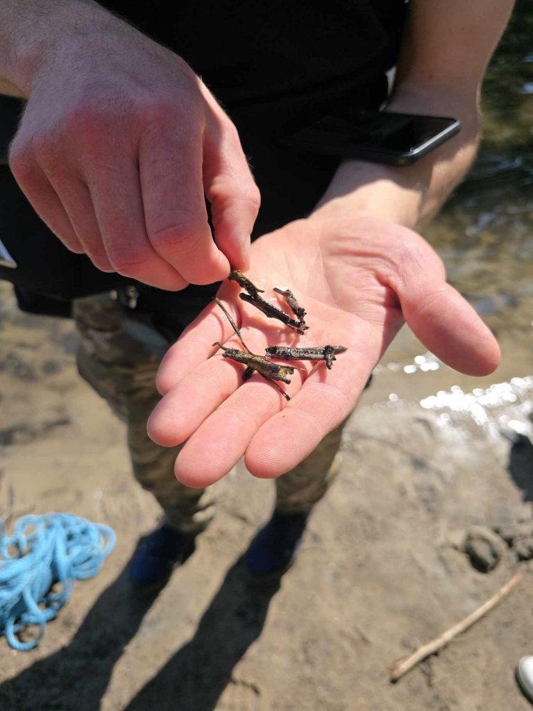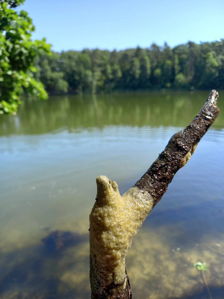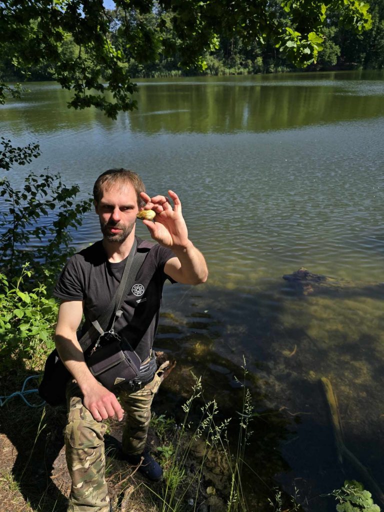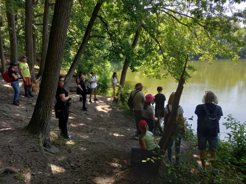 Zanim doszliśmy nad wodę przyglądaliśmy się sosnom masowo porażonym przez jemiołę, co jest zjawiskiem stosunkowo nowym i bardzo niepokojącym, świadczącym o słabej kondycji drzew w obliczu zmian klimatu. Podziwialiśmy też jeden z najpiękniejszych w regionie okaz dębu szypułkowego, rosnący przy parkingu. Rozważaliśmy o genezie powstania Jezior Babskich i związanym z tym ciekawym ukształtowaniem powierzchni. Przy brzegu znaleźliśmy liczne larwy chruścików, pełzające po dnie. Szukaliśmy jednego z naszych przyrodniczych symboli regionu – jezierzy morskiej. W tym celu posługiwaliśmy się specjalną kotwicą na linie. Sprawdziła się w boju, lecz niestety nasz plon był nader skąpy. Jedyną rośliną jaką udało się wyciągnąć z dna był wodny mech – zdrojek. Dużo ciekawszym „przyłowem” okazała się jakaś słodkowodna gąbka porastająca jedną z wyciągniętych zatopionych kłód. Było to przyczynkiem do rozważań na temat znaczenia takich zatopionych drzew, konarów, gałęzi dla organizmów wodnych, w tym ryb. Zwróciliśmy uwagę na żyjące w wodzie mięczaki, przede wszystkim na bardzo licznie występującą skójkę zaostrzoną, wrażliwą na zanieczyszczenie wody. Był też i rak, lecz niestety nie nasz szlachetny tylko obcy – pręgowaty, znacznie odporniejszy na zanieczyszczenia. Nad brzegiem jeziora Cyganek spotkaliśmy osobliwą turzycę nibyciborowatą oraz szalej jadowity. Dziwiliśmy się brązowemu kolorowi wody jeziora. Podziwialiśmy spotykane po drodze rośliny: kosaciec żółty, grążel żółty, rozchodnik wielki, dzwonek brzoskwiniolistny, kalinę koralową. Widzieliśmy liczne ślady żerowania bobra. Spotkaliśmy też owocniki osobliwego grzyba, który najprawdopodobniej był którąś z kustrzebek „wypaleniskowych”. Z drewnianego mostu nad Cybinką Maciej opowiadał o łęgu i rosnących w nim roślinach. Tu też zrobiliśmy sobie pamiątkowe zdjęcie. Dużo emocji budziły rzuty kotwicą i oczekiwanie na jezierzę ale niestety jej nie znaleźliśmy. Być może po prostu jej nie było ale możliwe, że to jeszcze zbyt wczesna pora na nią. Żartowaliśmy, że tytuł wyprawy był puszczeniem oka do uczestników. Ale chyba najważniejszy jest dobry humor i podziw dla otaczającej nas natury oraz możliwość poznania interesujących gatunków i ciekawostek przyrodniczych. A tego nie zabrakło!