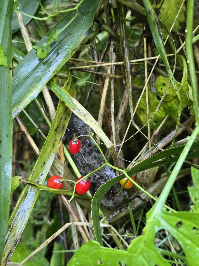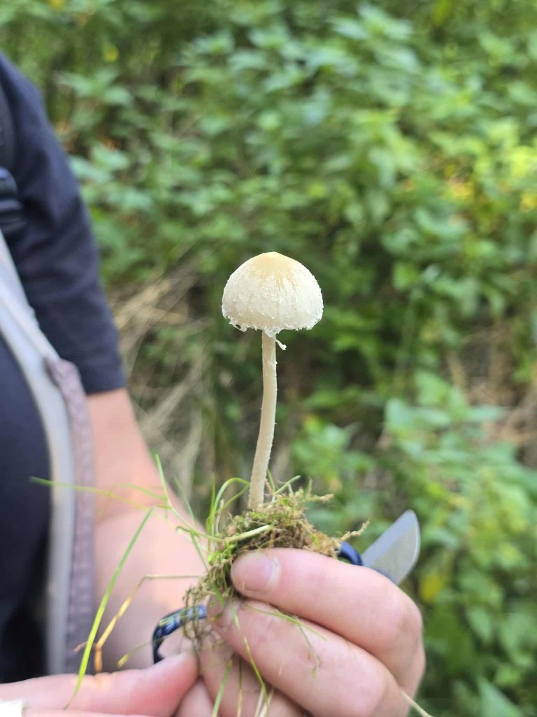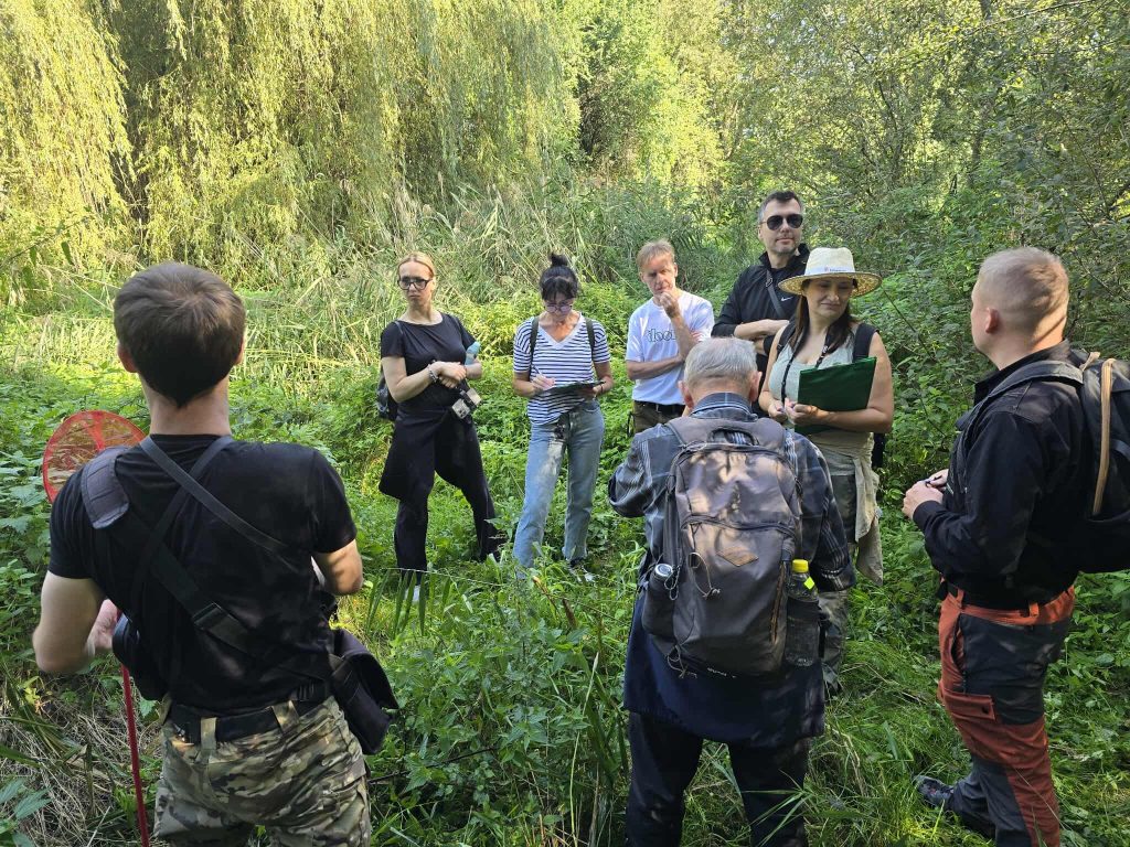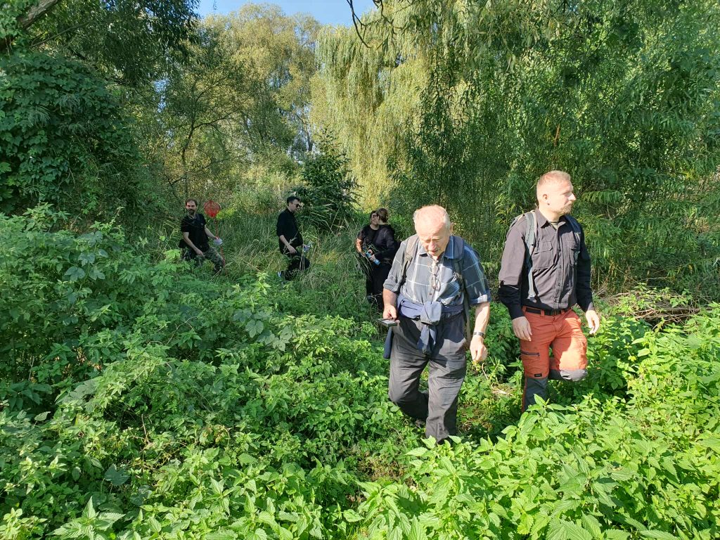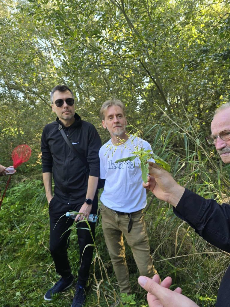 Zbiórka miała miejsce na parkingu przy sklepie w Wagowie. Po powitaniu i krótkim wstępie ruszyliśmy w trasę. Pierwszym przystankiem było zadrzewienie przydrożne, w miejscu dawniejszego stawu, przez który przepływał (i nadal okresowo płynie) niewielki ciek. Wkroczyliśmy do wnętrza tego zadrzewienia i tam dokonaliśmy obserwacji oraz omówiliśmy historię oraz perspektywy dla tego miejsca. Zwróciliśmy uwagę na występujące tu obce gatunki, które tak licznie występują w naszym otoczeniu i są tak znaczącym elementem współczesnego krajobrazu. W tym miejscu występuje m.in. inwazyjny winobluszcz pięciolistkowy, nawłoć kanadyjska, niecierpek drobnokwiatowy, a na skraju i granicy z drogą także robinia akacjowa. Wśród rodzimych roślin zwróciliśmy uwagę na kwitnącą i owocującą psiankę słodkogórz Solanum dulcamara oraz charakterystyczne liście kosaćca żółtego Iris pseudacorus, świadczące o wodnej przeszłości tego miejsca. Oprócz tego dominowała roślinność szuwarowa z trzciną, mozgą, turzycami i sitami, przechodząc stopniowo w ziołorośla zdominowane przez pokrzywę zwyczajną Urtica dioica. Z krzewów, dominowały wierzby: szara Salix cinerea i wiciowa Salix viminalis a wśród drzew wierzba krucha Salix x fragilis i olsza czarna Alnus glutinosa. Zwróciliśmy też uwagę na widoczne w tym miejscu owocniki grzybów, wśród których była kruchaweczka, zapewne zaroślowa Psathyrella candolleana, z charakterystycznymi zwisającymi z kapelusza resztkami osłony, czubajeczka cuchnąca Lepiota cristata odznaczająca się charakterystycznym zapachem owocników, a także wymagające dodatkowych czynności w celu oznaczenia: inne kruchaweczki oraz strzępiaki. Widoczne były również nadrewnowe: kisielnica wierzbowa Exidia recisa oraz gmatwica chropowata Daedaleopsis confragosa. Maciej wypatrzył sporysz w kłosku trawy – kostrzewy olbrzymiej Festuca gigantea. Wśród bezkręgowców, liczne były m.in. związane z wilgotnymi siedliskami ślimaki – bursztynki (Succinea sp.), czy pająki kwadratniki (Tetragnatha sp.). Udało się schwytać także niewielką, lecz barwną ćmę – ozimicę ochrówkę zwaną też morką wierzbówką Xanthia togata. Iza opowiadała o sporym bogactwie ptaków tego miejsca, lecz niestety o tej porze roku, nie było słychać zbyt wielu ich głosów. Tuż obok tego zadrzewienia wyznaczona jest działka z ofertą jej sprzedaży.