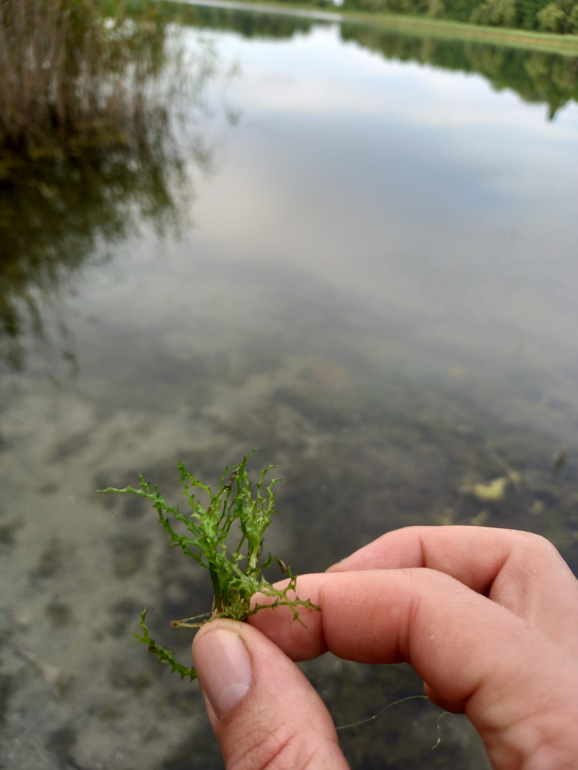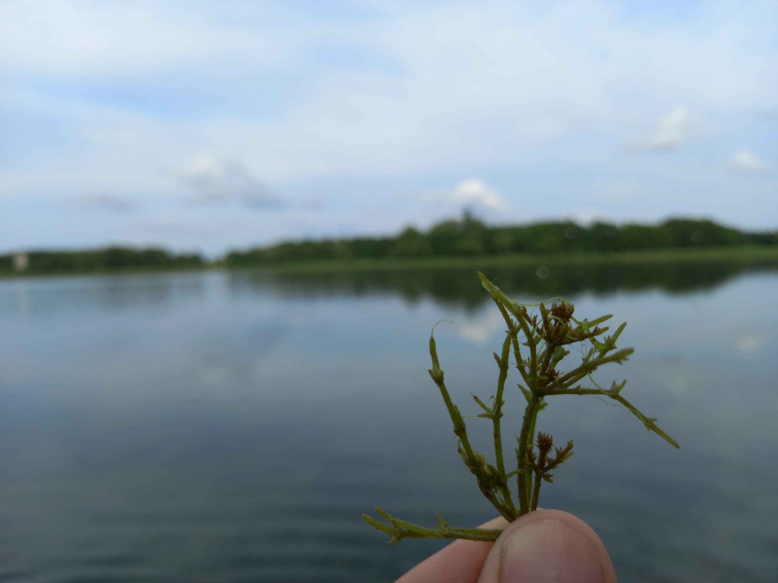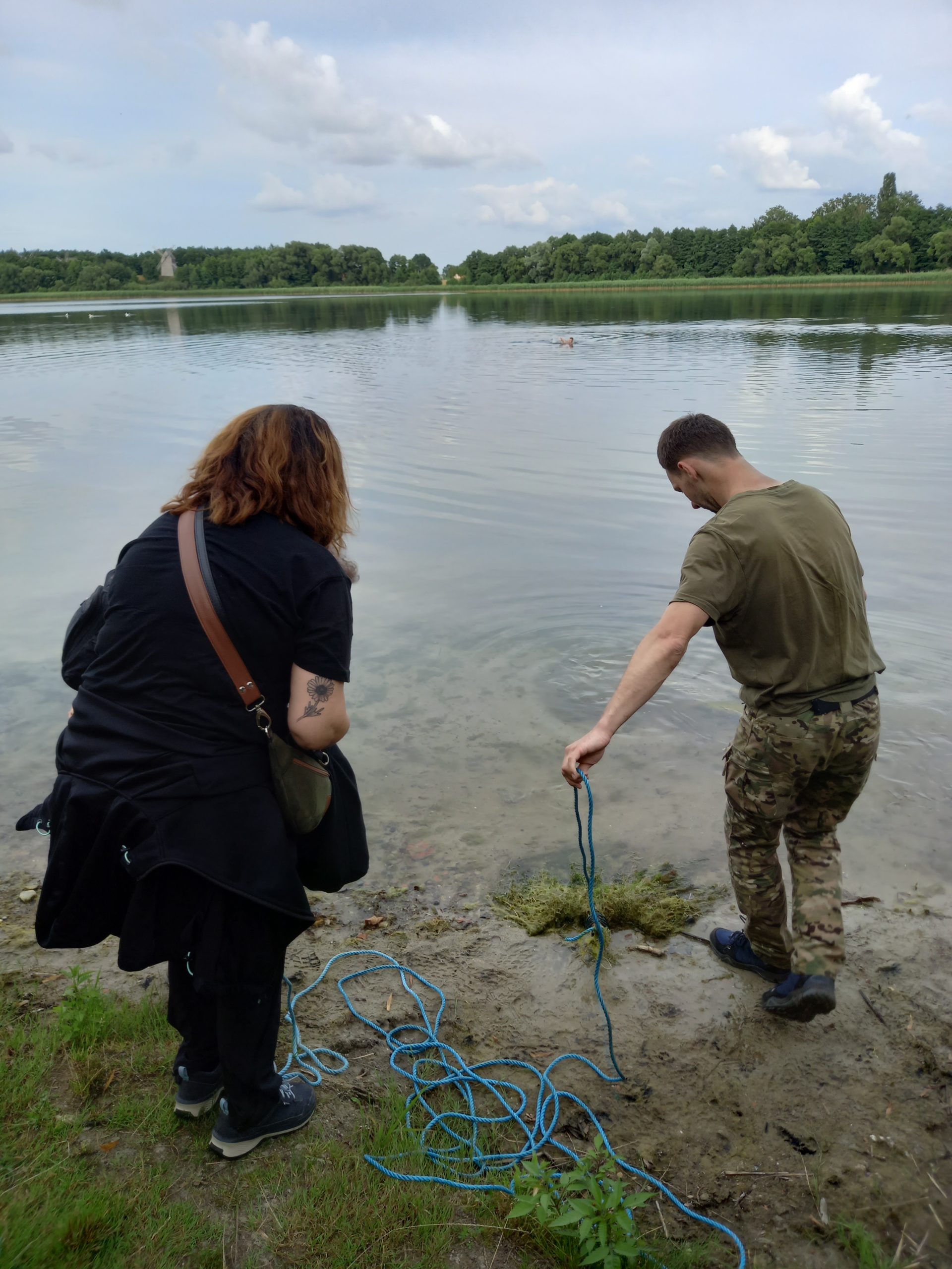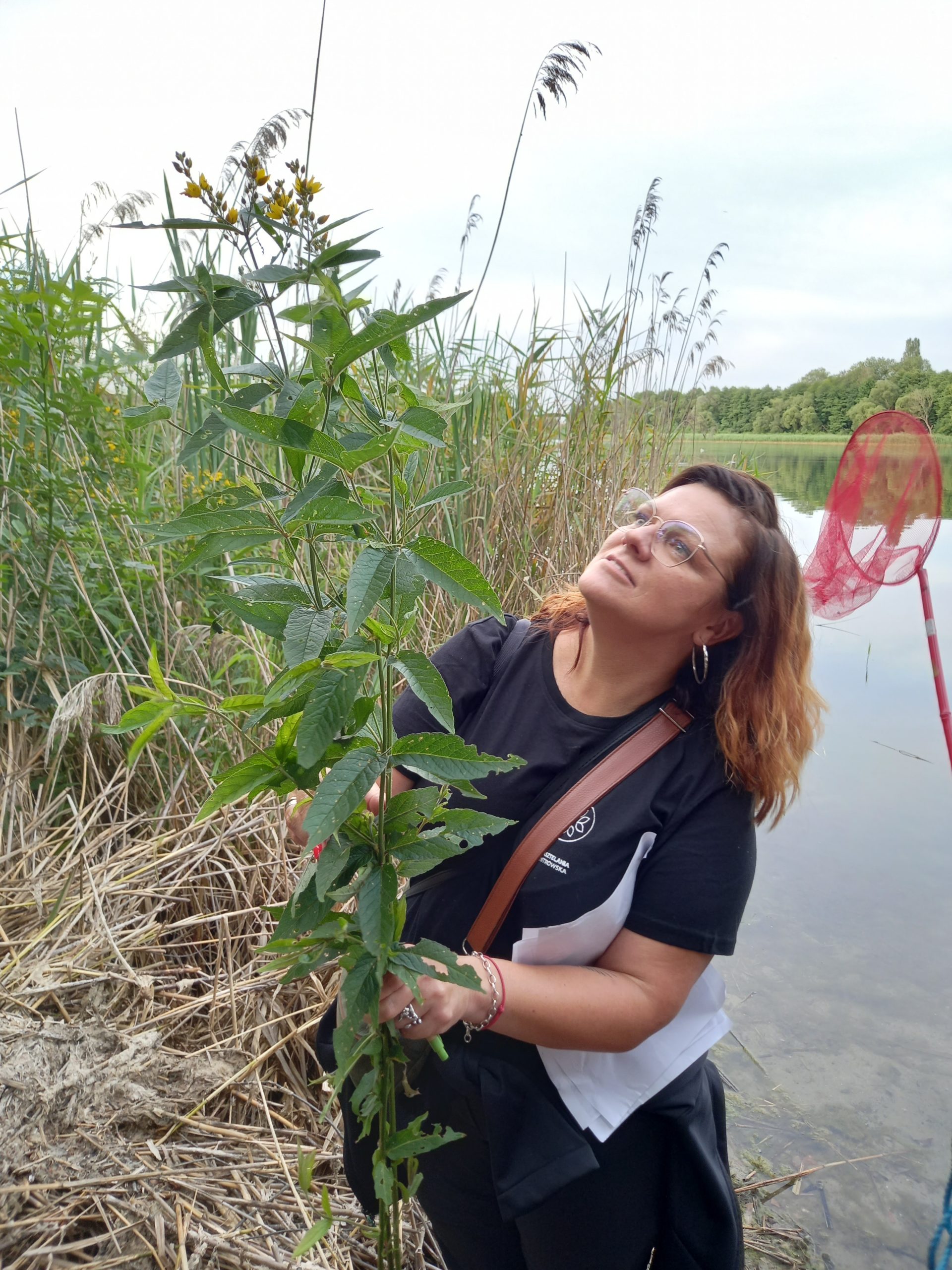 Uczestnicy wyprawy odwiedzili przede wszystkim naturalistyczny park w centrum miejscowości, ale on sam graniczy od wschodu z jeziorem Lednica. Podczas tej wyprawy zanurzyliśmy się zatem także do świata przyrody strefy przybrzeżnej. Wśród roślin zanurzonych zobaczyliśmy ramienice, które tworzą największe w regionie podwodne łąki właśnie w Lednicy (rozdział o nich znajdziecie w przewodniku po Kasztelanii Ostrowskiej). Monika zabrała nas do fragmentu szuwaru, gdzie otwiera się widok na taflę jeziora. Przez ziołorośla pokrzywowe dotarliśmy na żwirowy brzeg. Tego dnia liczyliśmy na znalezienie jezierzy morskiej, która także jest charakterystyczną rośliną dla Lednicy a rok 2025 jest Rokiem Jezierzy Morskiej – takiej okazji nie można było nie wykorzystać! Faktycznie w gąszczu wodnych roślin wyciągnęliśmy liczne gatunki podwodne, a wśród nich jezierzę. Tutaj jednak odeślemy do osobnego artykułu o tym jezierzowym spotkaniu, bo wydobyta z toni roślina zaskoczyła nas, wywołała zapowiedzi prof. Mariusza Lamentowicza oraz sprawiła ogromny prezent w Roku Jezierzy, zebranym uczestnikom, inicjatorce wyprawy Monice Bednarczyk oraz naszemu gronu przyrodników. Ekscytujące!